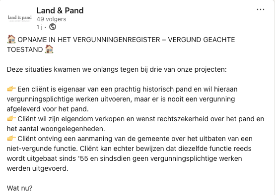 Onlangs waren er drie verschillende projecten waarbij een opname in het vergunningenregister noodzakelijk was. Voor deze dossiers gingen we aan de slag om zekerheid te bieden omtrent de laatst vergunde toestand van de panden in kwestie. Het is namelijk mogelijk een ‘vermoeden van vergunning’ vast te stellen, mits er voldaan wordt aan de voorwaarden.